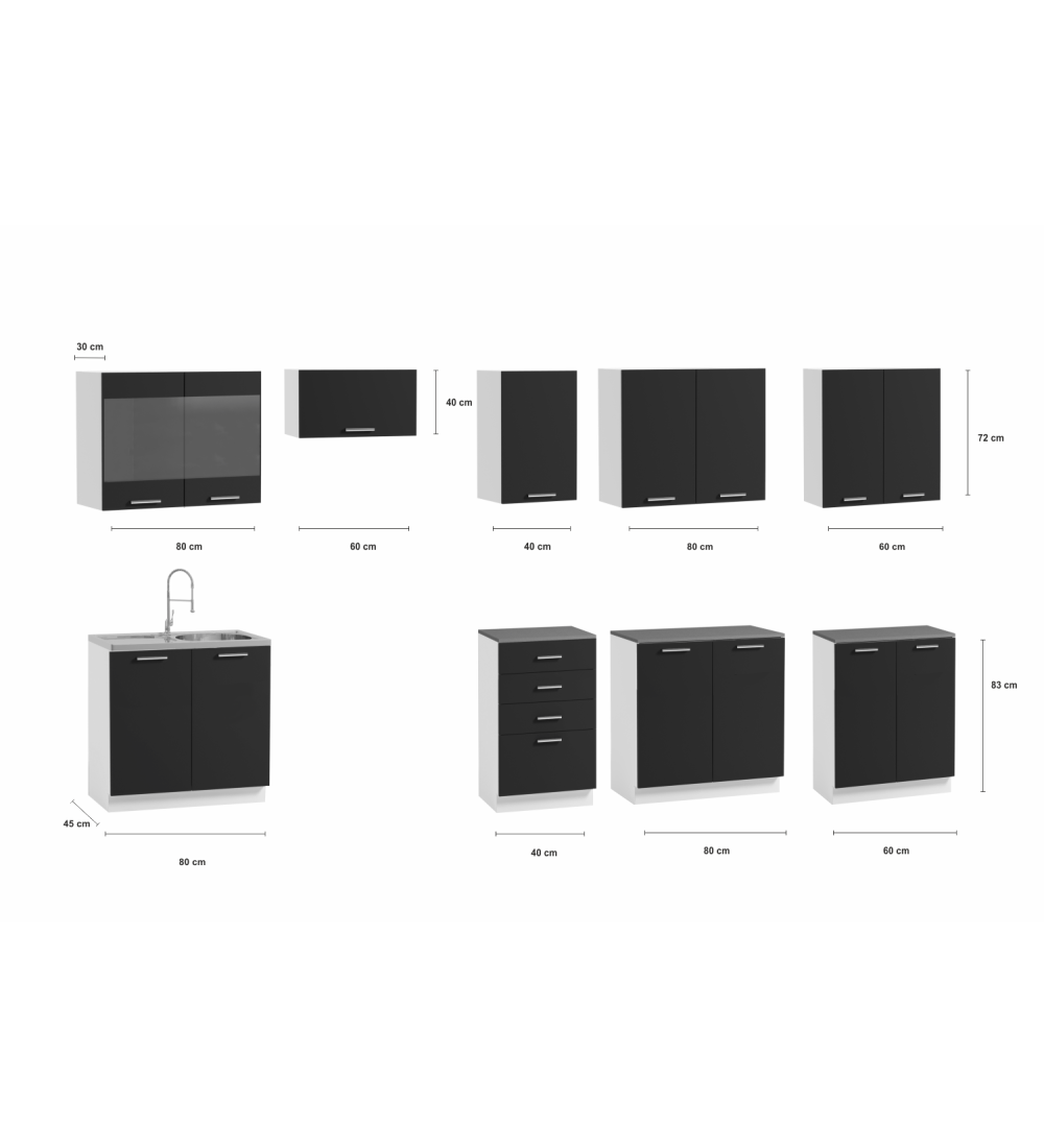 - Výška spodních skříněk: 86 cm (2,8 cm pracovní deska / 10 cm sokl)