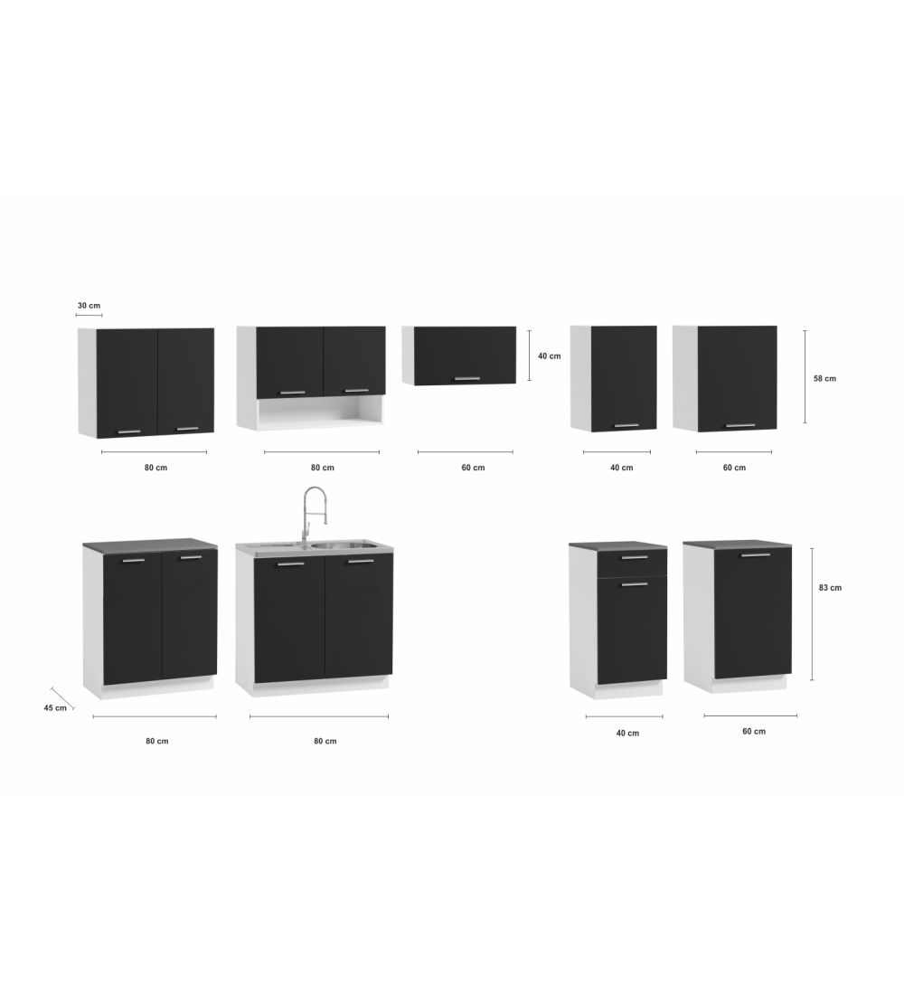 - Výška spodních skříněk: 86 cm (2,8 cm pracovní deska / 10 cm sokl)