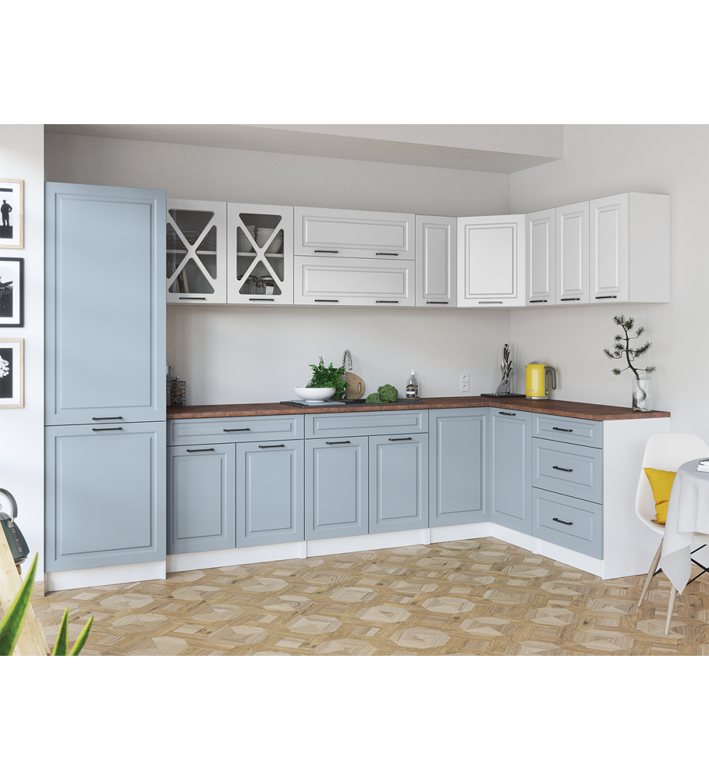 Rohová kuchyňská linka EROS SCANDI 310/150 bílá + světle modrá
