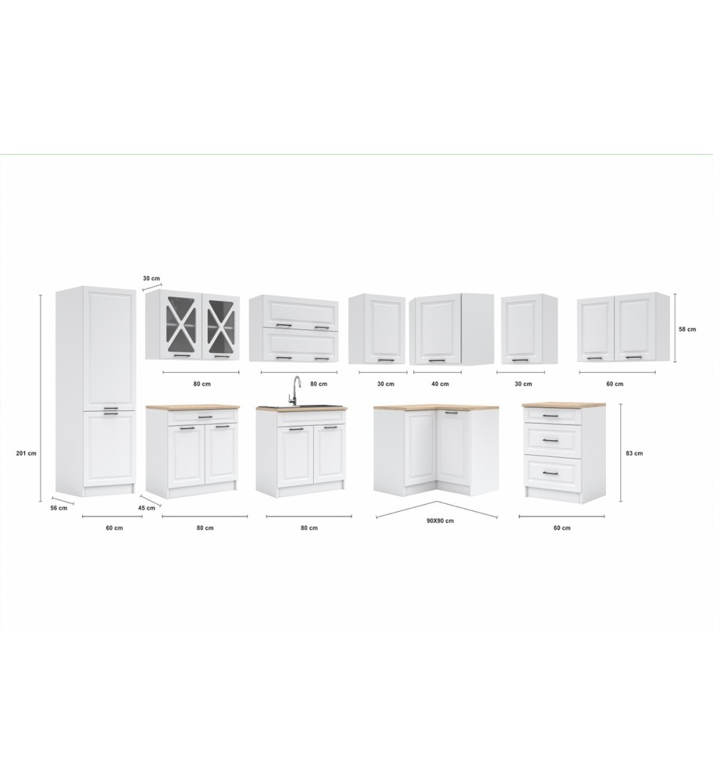 - Pracovní deska na rohové skříňce je vždy dělená 90 cm + 30 cm!