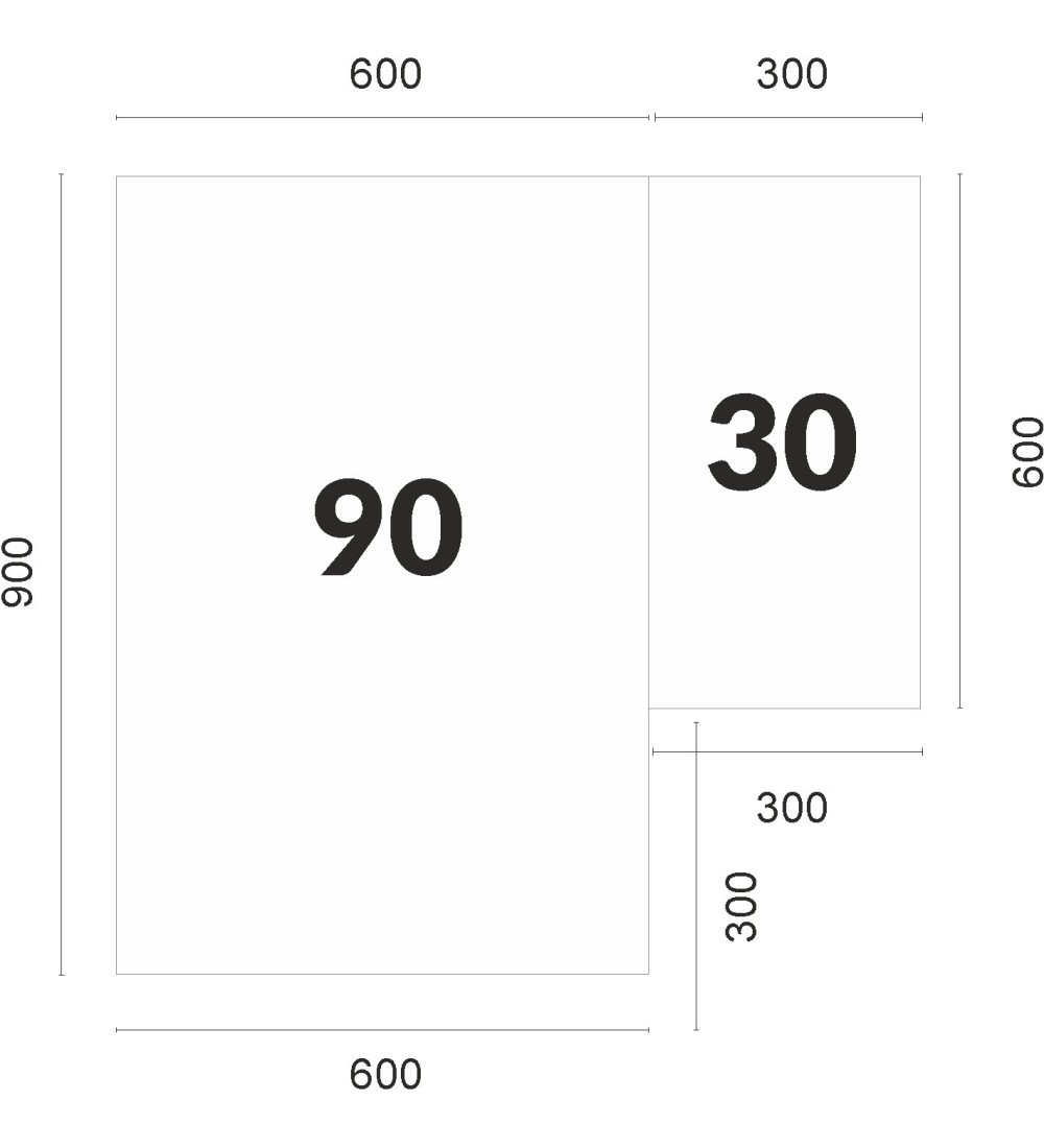 - Pracovní deska na rohové skříňce je vždy dělená 90 cm + 30 cm!