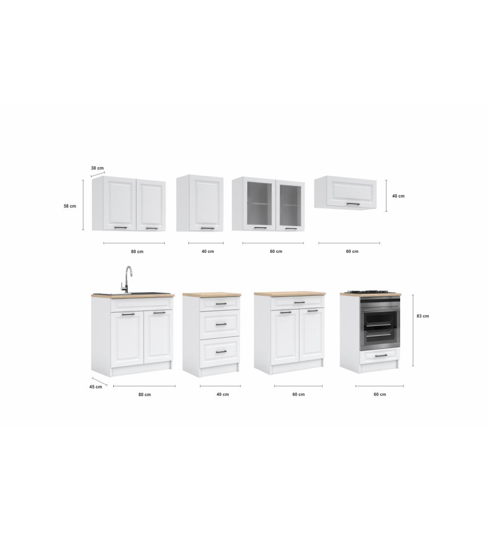 - Výška skříňěk dolních: 86 cm (2,8 cm pracovní deska/ 10 cm sokl)