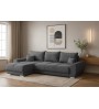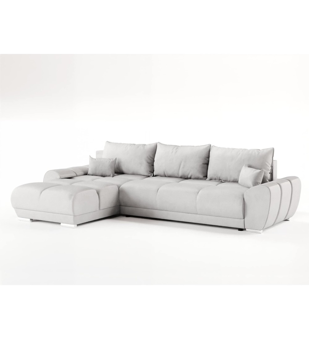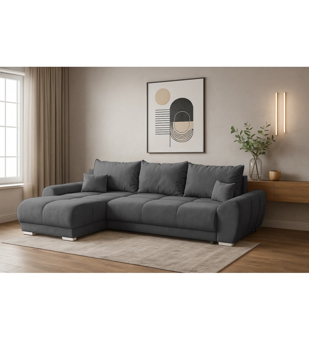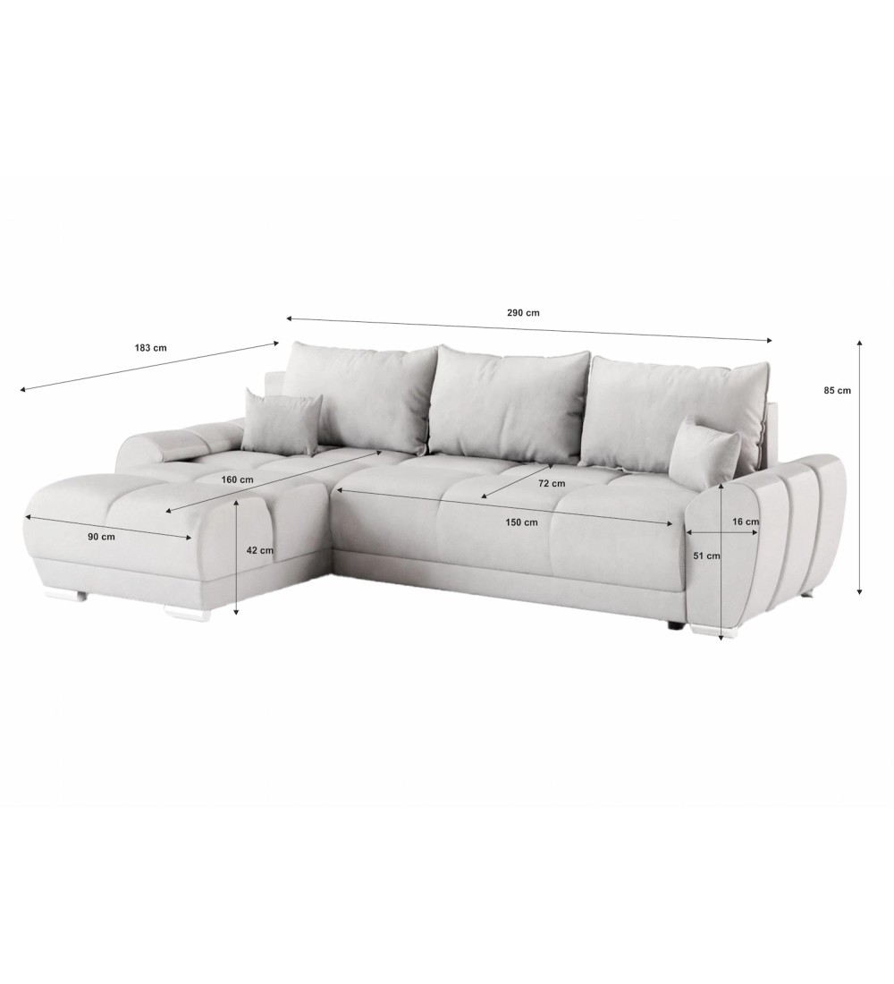 Model EGON je vybaven funkcí spaní s prostornou plochou o rozměrech 130x220 cm, což z něj činí ideální řešení i pro hosty. Další výhodou je prostorná přihrádka na ložní prádlo, diskrétně skrytá v korpusu nábytku, která usnadňuje udržování pořádku. Pohodlí používání zajišťuje výplň z vlnité pružiny a vysoce kvalitní pěny T-30, které zaručují pohodlí a odolnost proti deformaci. Vkusné prošívání na sedáku a opěradlech dodává rohové pohovce stylový vzhled, který zdůrazňuje její moderní charakter. Solidní zpracování a odolné materiály dělají z rohové pohovky EGON investici na mnoho let. Je to vynikající volba pro lidi, kteří si cení pohodlí, moderního designu a praktických řešení v jednom.